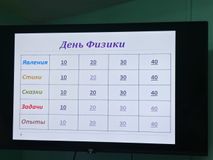 Присоединяясь к Всемирному празднику, в техникуме был проведен День физики. Подготовлена информация об основных значимых открытиях и знаменитых ученых-физиках. В группах первого курса М-11, ТОР-11, ВЕБ-11 и ДО-11 на занятиях по физике проведена игра «Физические явления», в которой предлагалось в картинках, стихах, сказках и задачах узнать и прокомментировать о чём идет речь. Увлекательной частью занятия было проведение занимательных опытов. Студенты случайным образом выбирали категорию, отвечали на вопросы и набирали баллы, которые были переведены в оценки.